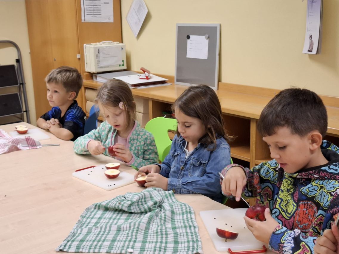 Außerdem wurde nachgeschaut, wie viele Kerne so ein kleiner Apfel hat. Wir sind draufgekommen, dass im Kerngehäuse 5 bis 10 Kerne sind. Anschließend wurde aus den Äpfeln ein Apfelkompott zubereitet. Wie das genau geht, könnt ihr in unserem Rezeptbuch nachlesen.