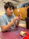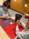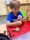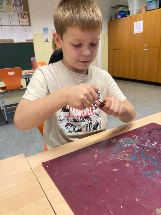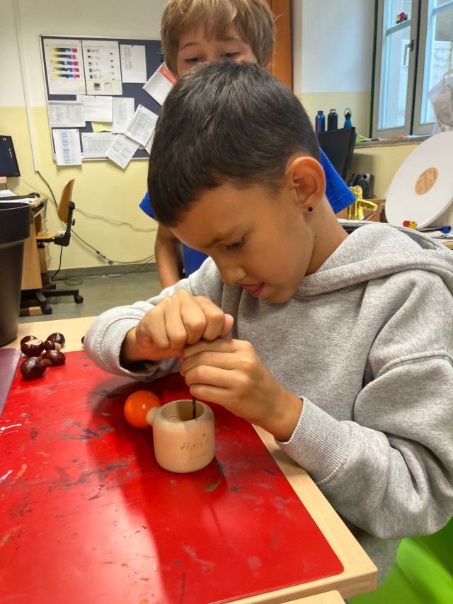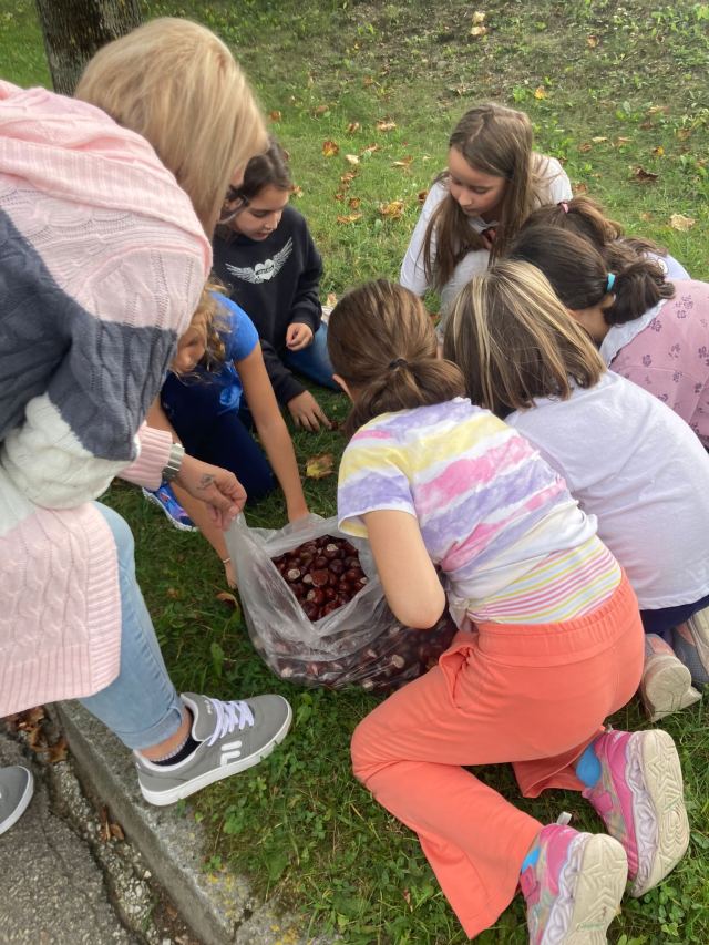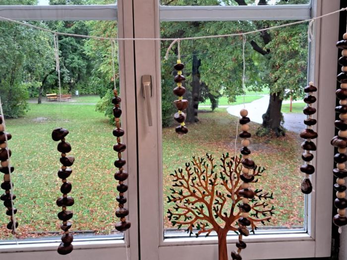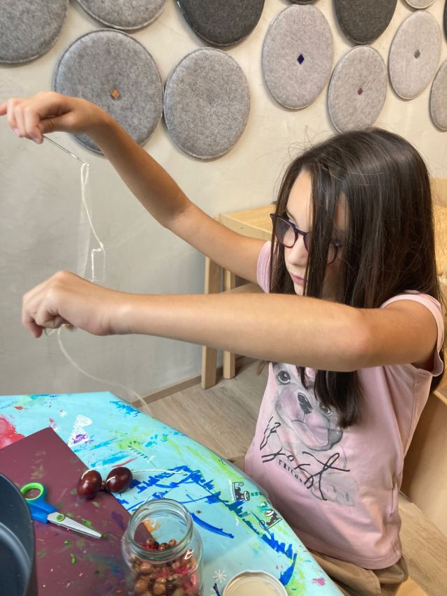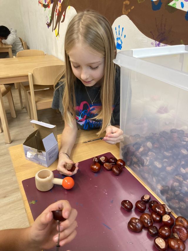 Für unsere Girlanden sammeln wir viele Kastanien, die wir dann durchbohren und mit Holzperlen gemeinsam auffädeln.
