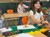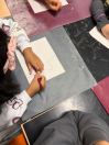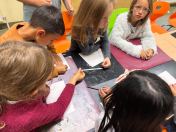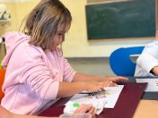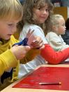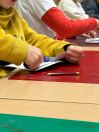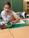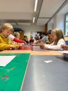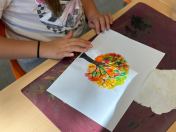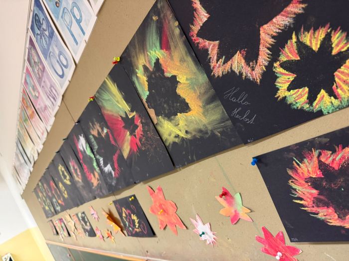 Um den Freizeitraum herbstlich zu gestalten, schneiden wir Blätterschablonen aus. Auf schwarzem Tonpapier ziehen wir dann Kreidestaub ab. Dabei entstehen bunte Blätterkreationen.